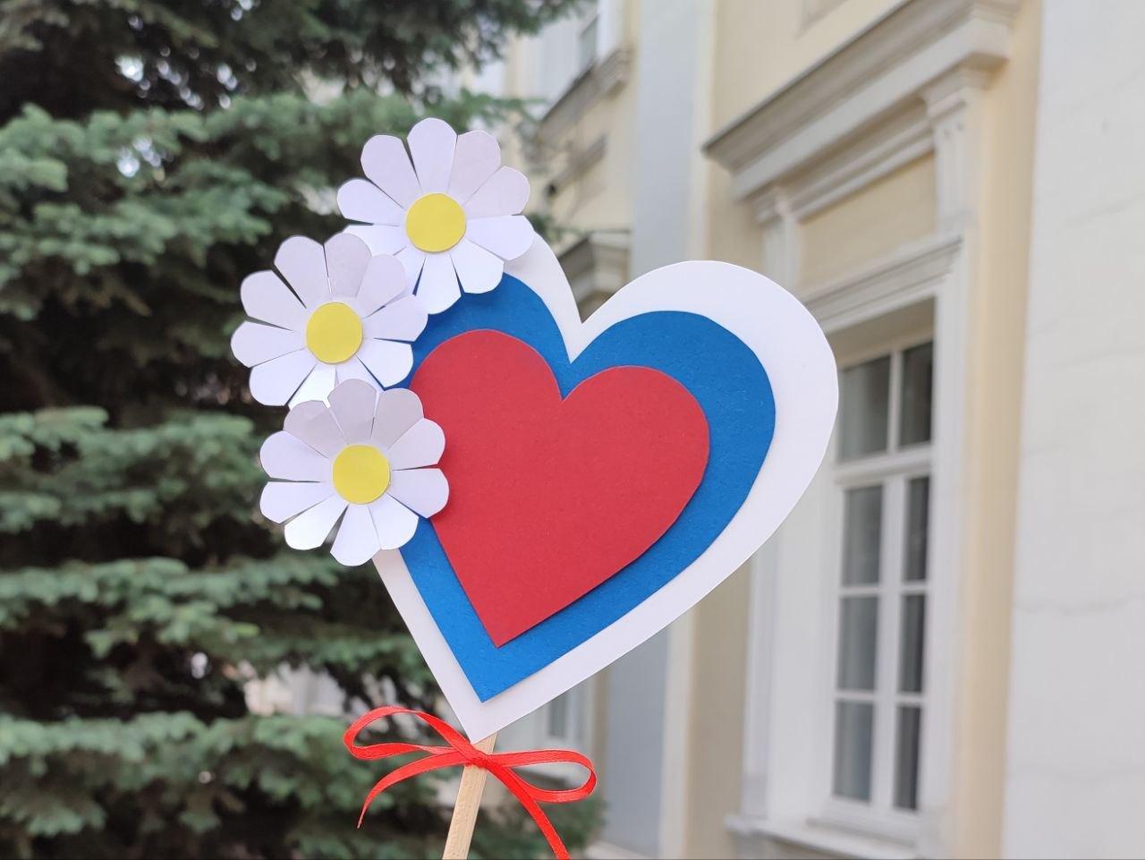 После каждый участник создаст оригинальную декоративную композицию в форме сердца, украшенную элементами цветов государственного флага и выразительными белыми ромашками, выполненными в технике бумажной аппликации.